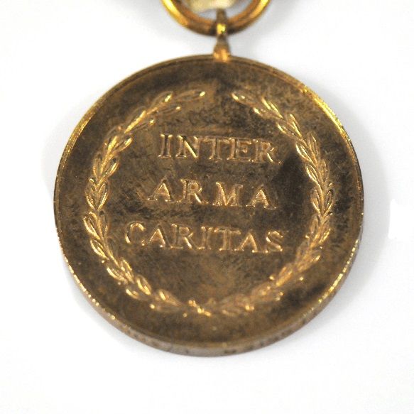 The reverse (back) of the Red Cross Medal has the Latin words 'INTER ARMA CARITAS' (in English 'Amidst Arms, Charity') which means that even in wartime there can be kindness.