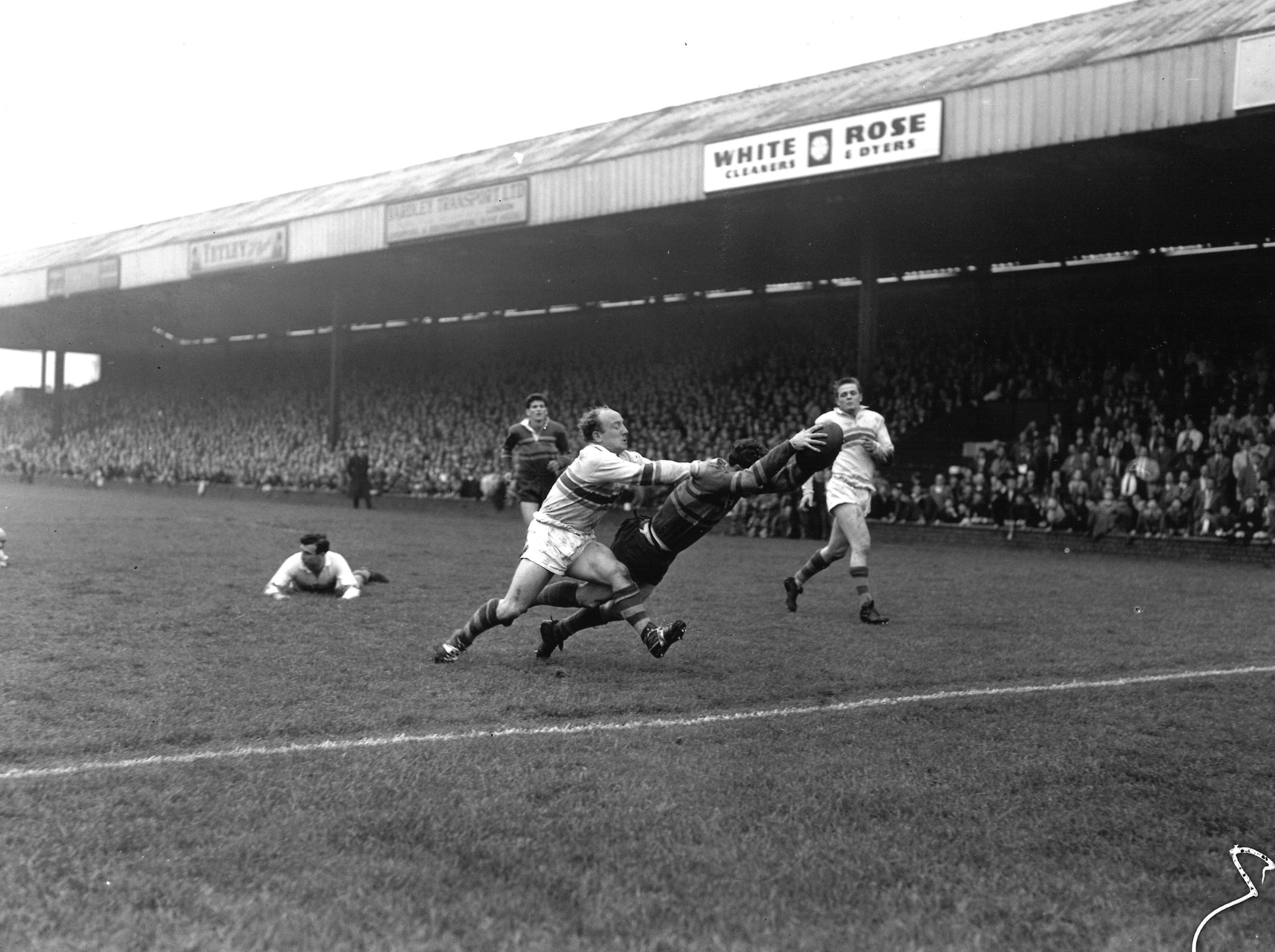 This photograph was taken during a Rugby League match at Headingley on 7th October 1961. The match between Leeds and Warrington ended Leeds 10, Warrington 9. The photograph shows Ratcliffe, the Leeds winger, scoring with Edwards of Warrington unable to stop him.