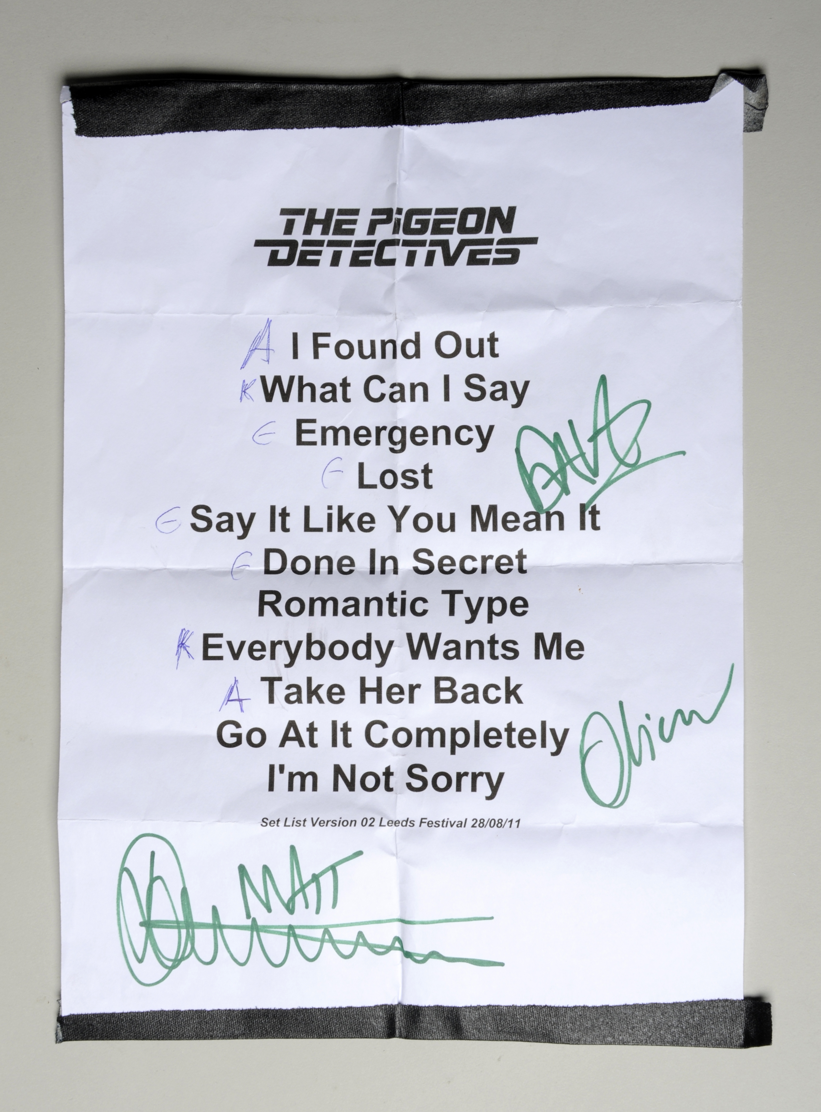 This set list from 'The Pigeon Detectives' would have probably been used by a band member to remind them which songs they were playing and in what order. What do you think the duct tape stuck top and bottom would have been used for?