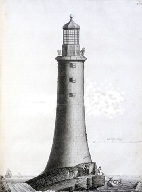 Illustration showing John Smeaton's Eddystone Lighthouse before the weakening of the rock beneath caused it to be moved in 1877