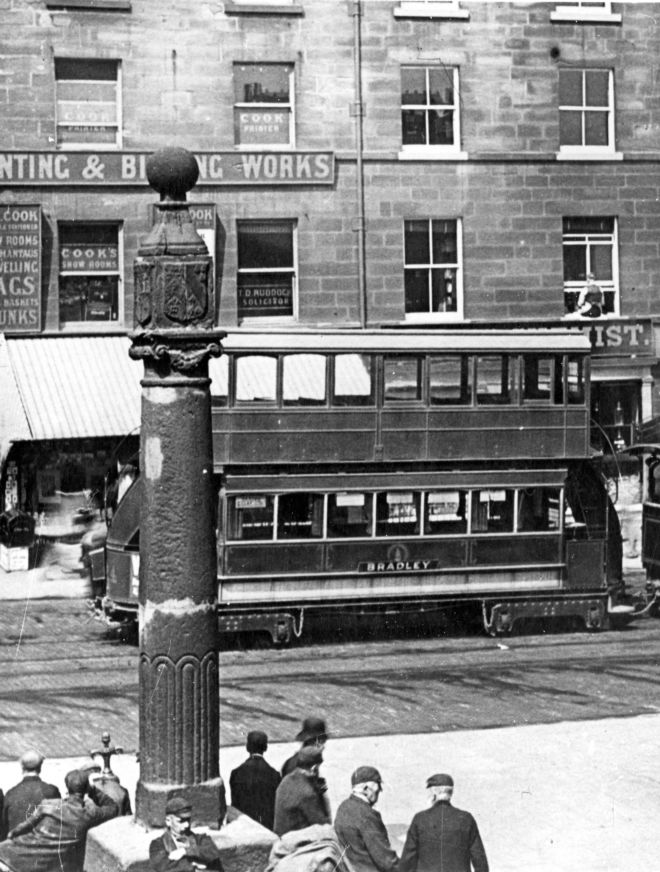 Steam powered tram car travelling along New Street and passing Market Place, Huddersfield. 1896.Trams and trolleybuses were a very popular form of transport. They stopped being used for many years, but are being used in many English cities now. Can you think of any reasons why?