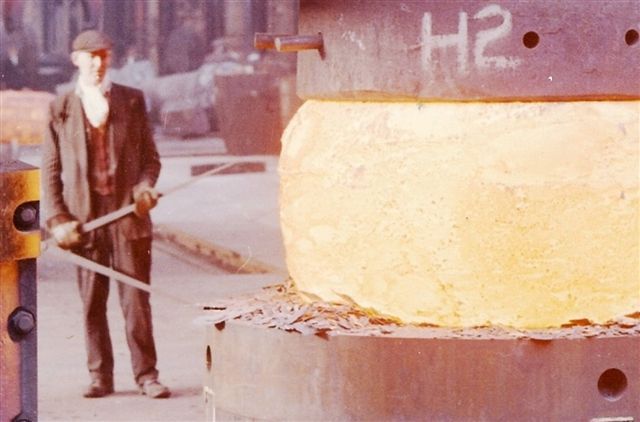A Steel worker operating a steel press with red hot steel in the 1950s.