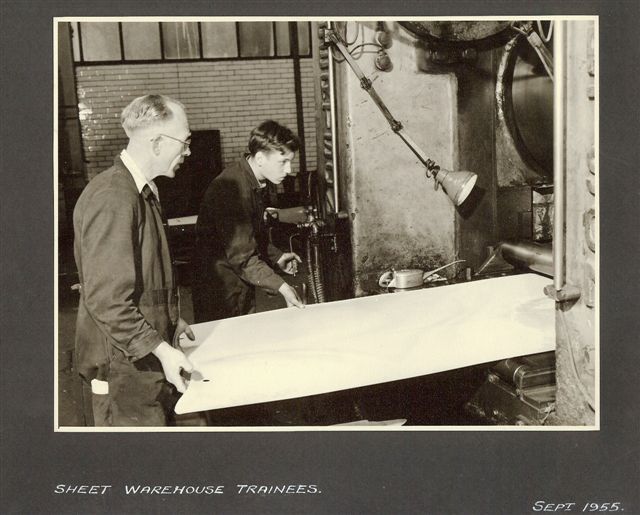 A black and white photograph showing a steel worker and apprentice rolling sheet metal in the Brown Bailey steel works, in 1955.