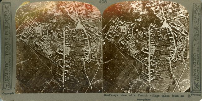 Stereoscope card showing a bird's-eye view of a French village taken from an aeroplane, published c.1918-1920, by Realistic Travels Publishers