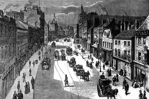 This illustration shows the Briggate area of Leeds in Victorian times (late 1880s). What do you notice running along the surface of the street? How do you think people and goods moved around the city?