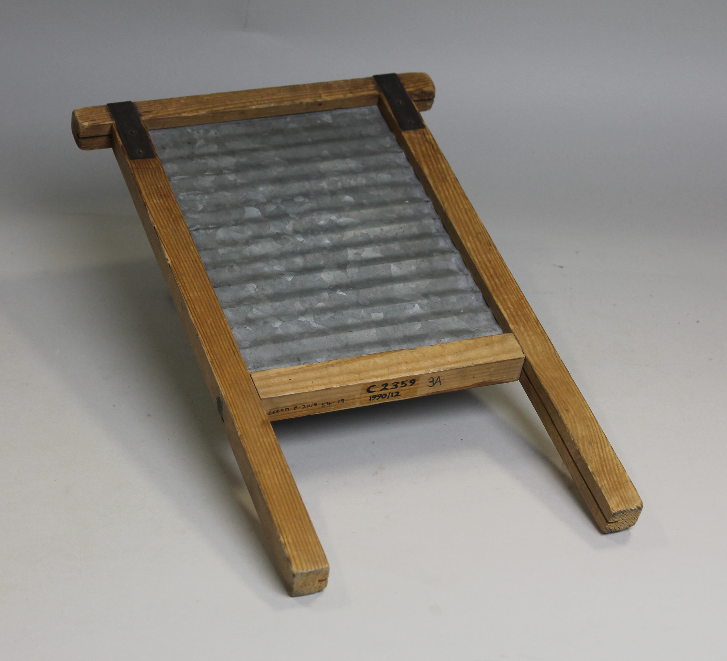 A rubbing board or washboard. Clothes that had been soaked in hot, soapy water would be rubbed against the ridged metal area to help move the soap through the material and remove any dirt.