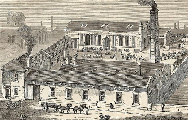An Illustration of Newhall Wire Mills. There are people and horses and carriages in the foreground of the picture and in the courtyard of the mills.