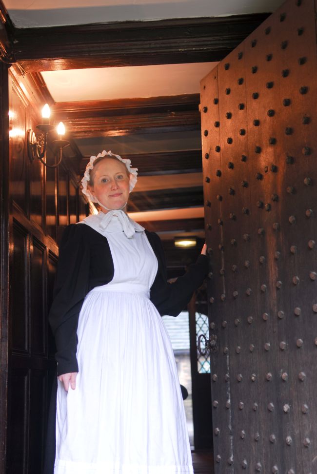 A servant greeting visitors to Shibden Hall. Servants were expected to look smart at all times and keep their uniform in good repair.