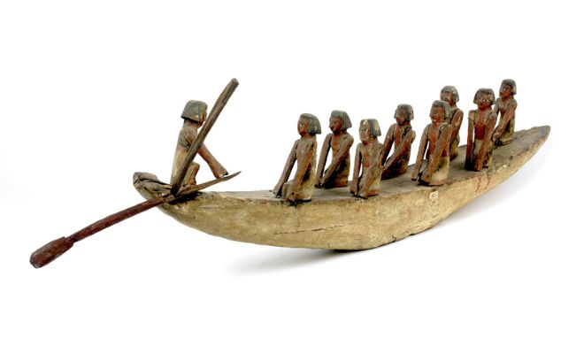 This wooden Funerary Boat model from 1990 BCE came from the coffin of a courtier to the Pharoah. Model funerary boats were placed in the Middle Kingdom Egyptian graves to transport the deceased in the afterlife.