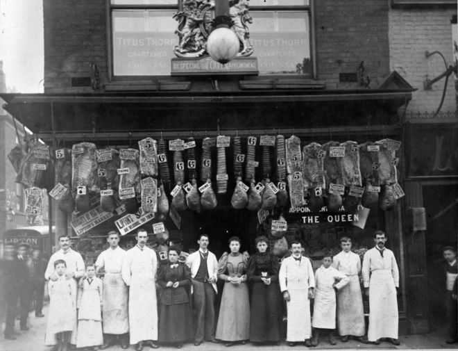 Workers outside the grocers shop Lipton's