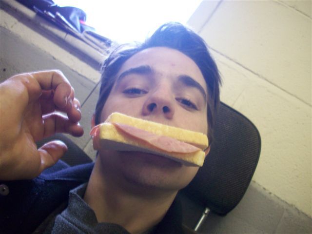 A young Sheffield steel worker on his lunch break with a ham sandwich in his mouth.
